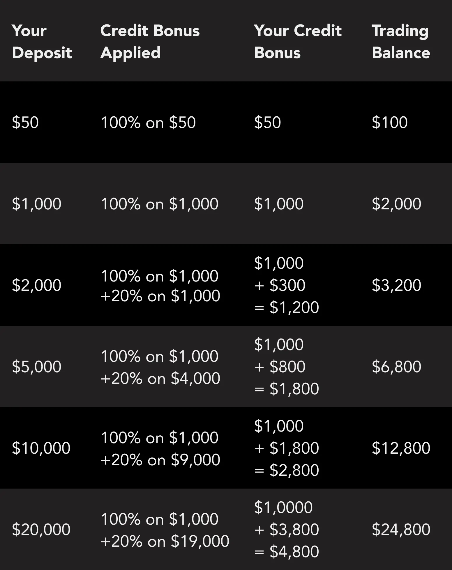 4.Eligible Clients (both new and existing clients), who meet the criteria set forth herein are able to receive credit bonuses or otherwise known as trading credit, equal to: