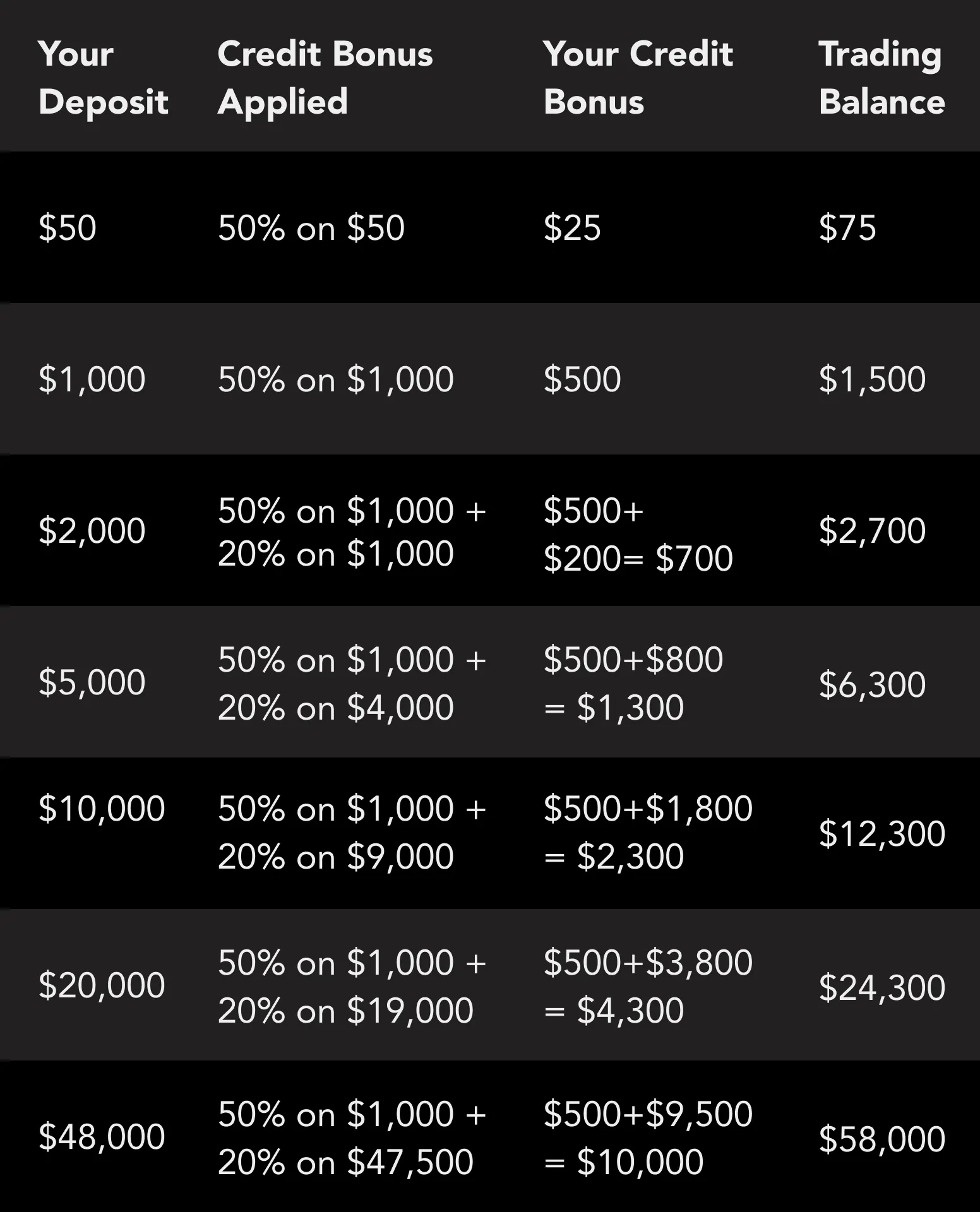 5.Eligible Clients (both new and existing clients), who meet the criteria set forth herein are able to receive credit bonuses or otherwise known as trading credit, equal to: