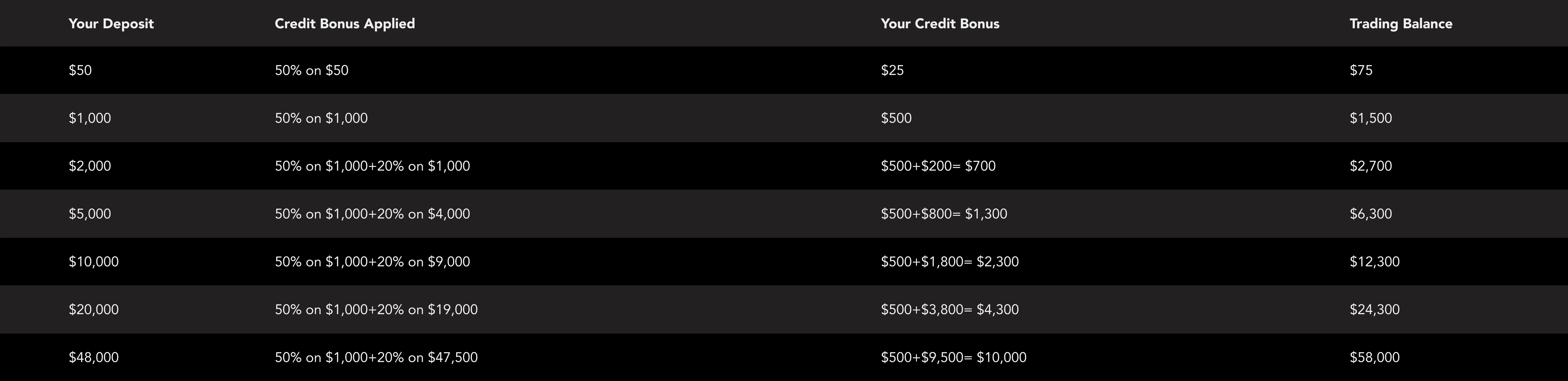 2.Only a new deposit during the promotion can apply for the credit bonus. A new deposit does not include the funds transfer between the accounts that are under the same name (internal transfer), refer-a-friend bonuses, and cash adjustments.