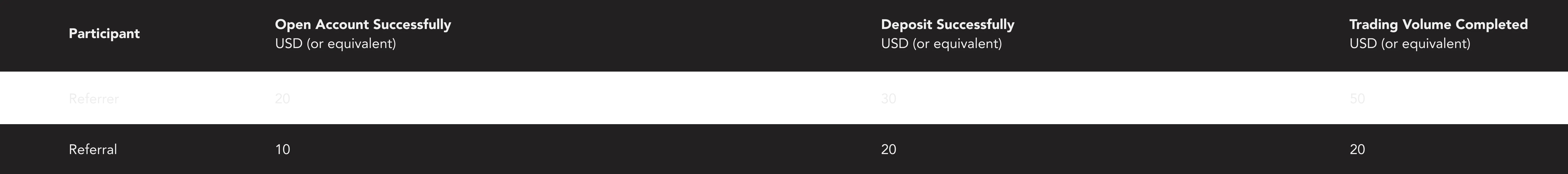 • b.The referred client’s initial deposit is equal to or more than 500 USD (or equivalent) into his/her trading account within 1 month after his/her live trading account opened.